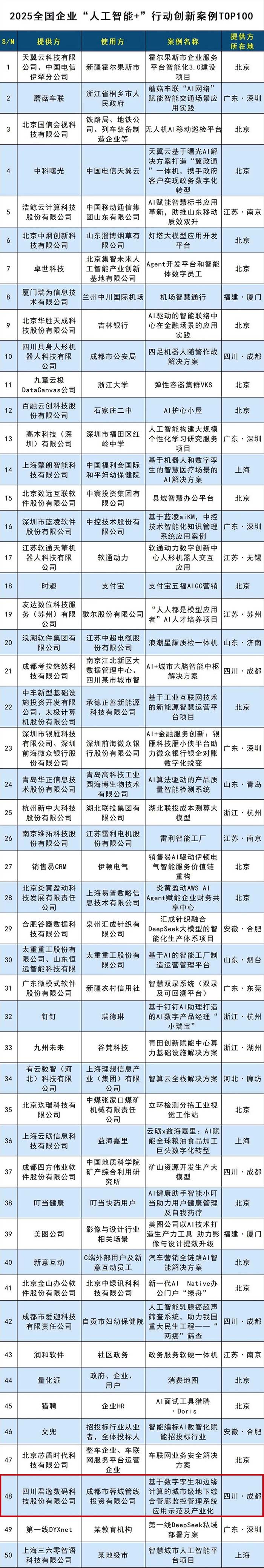2025年4月8日,由中国科学院主管、科学出版社主办的商业期刊《互联网周刊》(CIW)联合德本咨询(DBC)、中国社会科学院信息化研究中心(CIS)发布了“2025全国企业“人工智能+”行动创新案例TOP100”。君逸数码凭借在人工智能领域的研发创新与场景应用,以《基于数字孪生和边缘计算的城市级地下综合管廊监控管理系统应用示范及产业化》这一创新案例成功上榜。