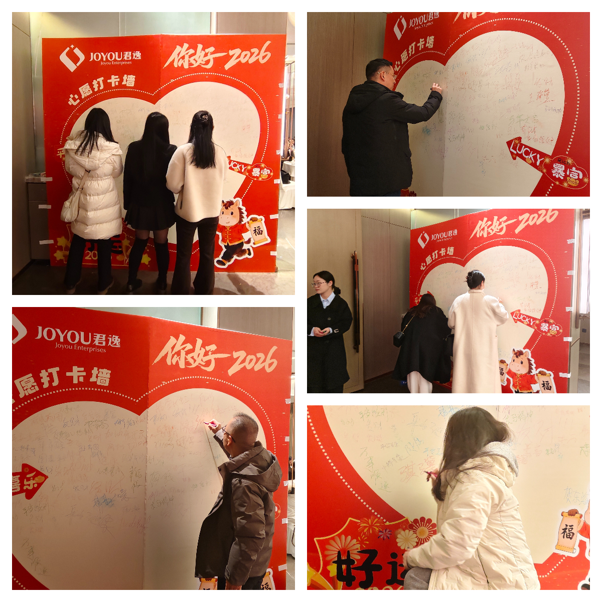 年会序幕于17:30拉开,君逸的同仁们陆续抵达现场,在签名墙上留下自己对马年的期许与祝福。“马到成功”、“马上有钱”······笑语寒暄间,温暖与期待洋溢在整个会场。