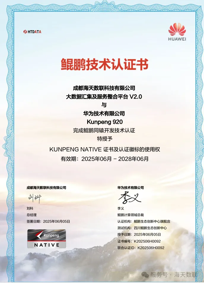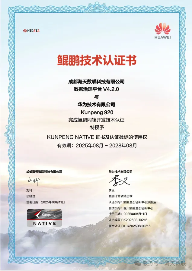 在数字化转型与国产化替代加速推进的背景下,基于鲲鹏架构的自主可控计算生态已成为国家数字基础设施建设的核心支撑。“KUNPENG NATIVE” 认证作为鲲鹏生态最深层次的技术认证,绝非简单的兼容性测试,而是对软件产品 “深度适配、性能最优、架构协同” 的严苛检验。海天数联的数据产品能够通过这一认证,背后是研发团队在国产大数据基础软件自主创新的持续技术攻坚。