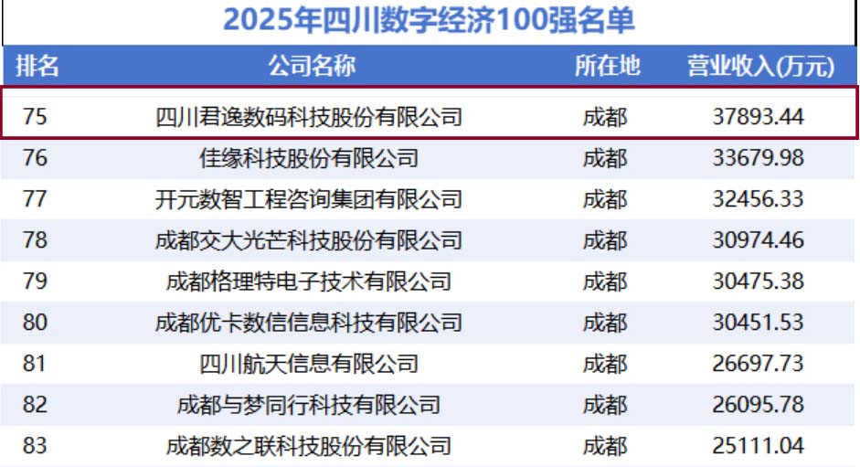 10月23日,2025四川大企业大集团发展大会在成都隆重举行。大会现场,四川省企业联合会发布了《四川100强企业发展报告(2025)》,并揭晓了四川企业100强、制造业100强、建筑业100强、服务业100强及数字经济100强五大榜单。君逸数码凭借在智慧城市建设和数字经济领域的卓越表现与创新实力,成功入选 “2025四川数字经济100强” 榜单。