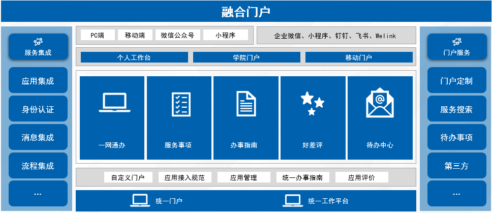 融合门户是学校入口统一、部门协同、数据互通、一网办理、高效便捷的智慧校园一体化服务平台,支撑线下窗口服务大厅、线上网上办事大厅、移动客户端、自助终端等多种形式相结合、相统一的校务服务体系。推动实现以统一身份认证系统为基础的“一号”互通,以智慧校园一体化服务平台为支撑的“一站”受理,以校务服务管理平台、为支撑的“一网”通办。实现互联网和校务服务深度融合,全面提升校务服务事项从受理、审批到办结全流程网上办结率。构建跨校区、跨层级的一体化校务服务体系,大幅提升各级部门单位服务智慧化水平,让校务服务更聪明,让学生、教职工和社会公众办事更方便、更快捷、更有效率。