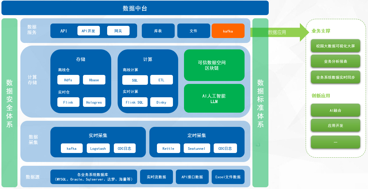 数据中台是学校内外部多源数据进行统一采集、治理、建模、服务化的综合平台,形成可持续复用数据资源的机制。其本质是“数据仓库+数据服务中间件”,强调数据的业务价值转化,而非仅存储管理。