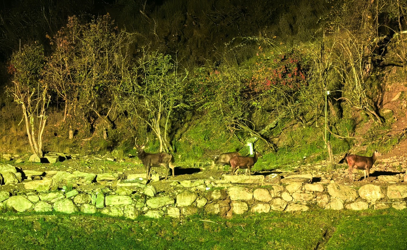 夜幕降临后,景区进入了另一番静谧的世界。许多同事选择自由活动,有幸目睹了国家保护动物——野生水鹿在夜色中悠然觅食的身影,这一难得的邂逅为第一天的行程增添了一份惊喜与自然的野趣。